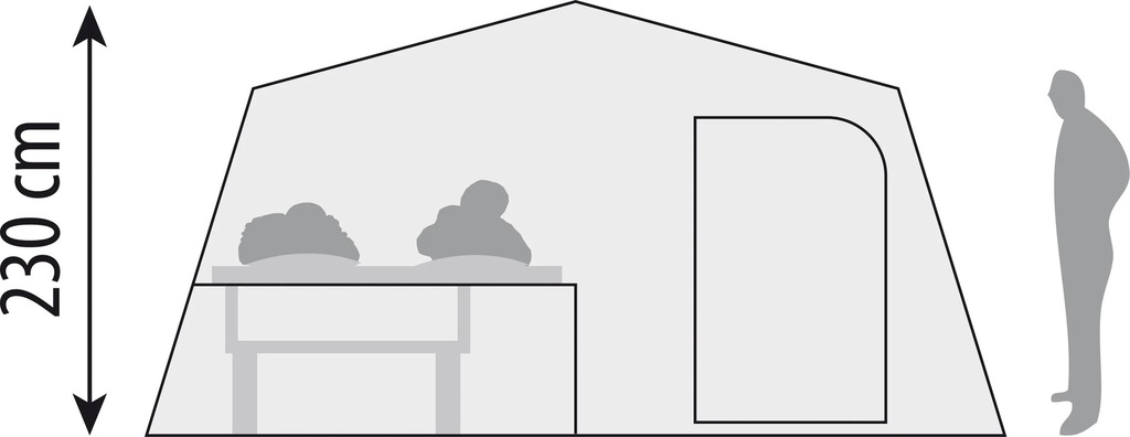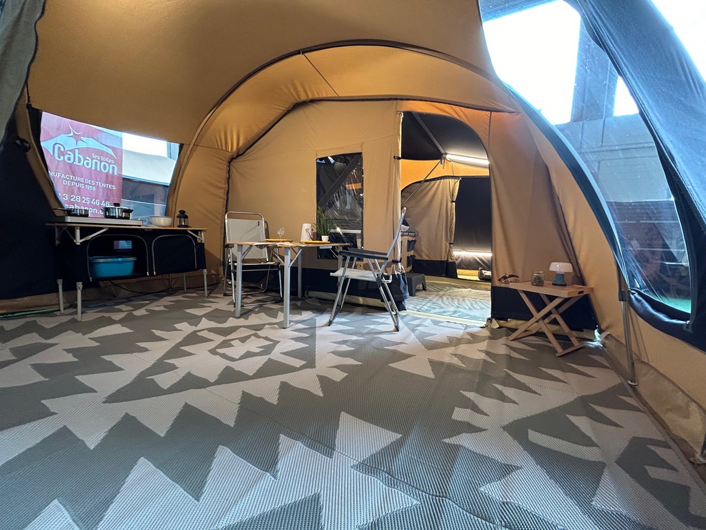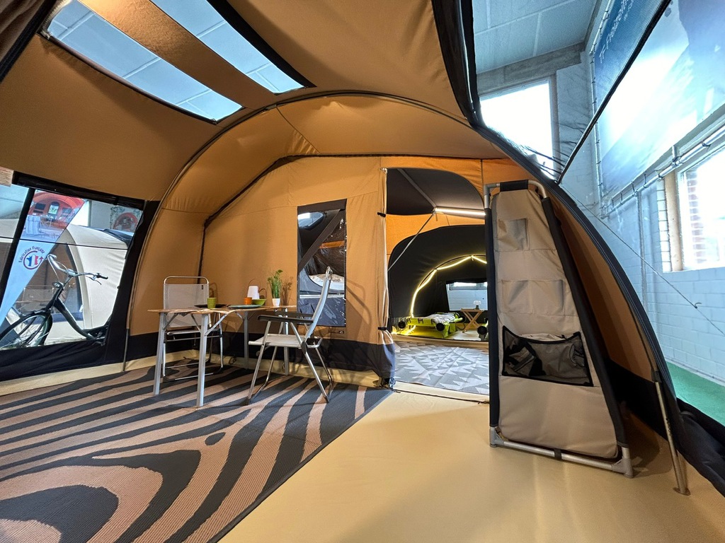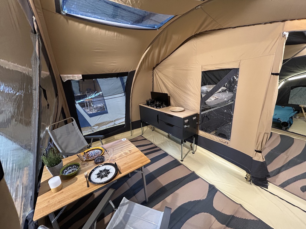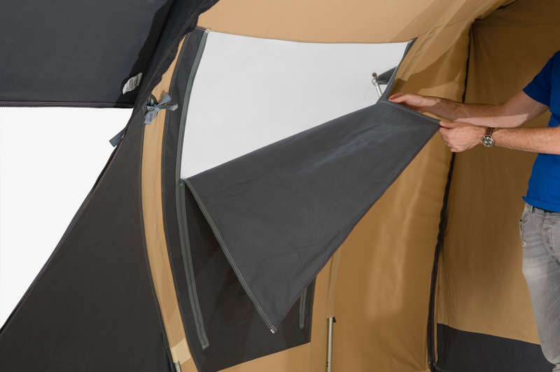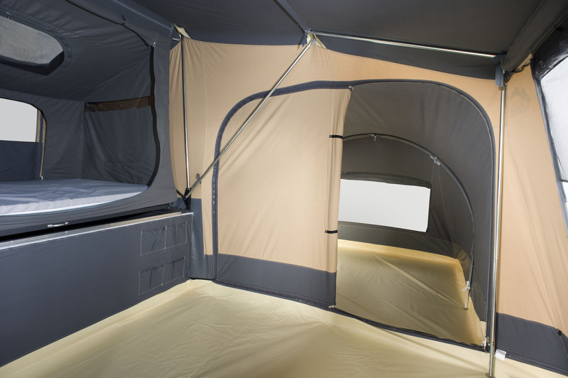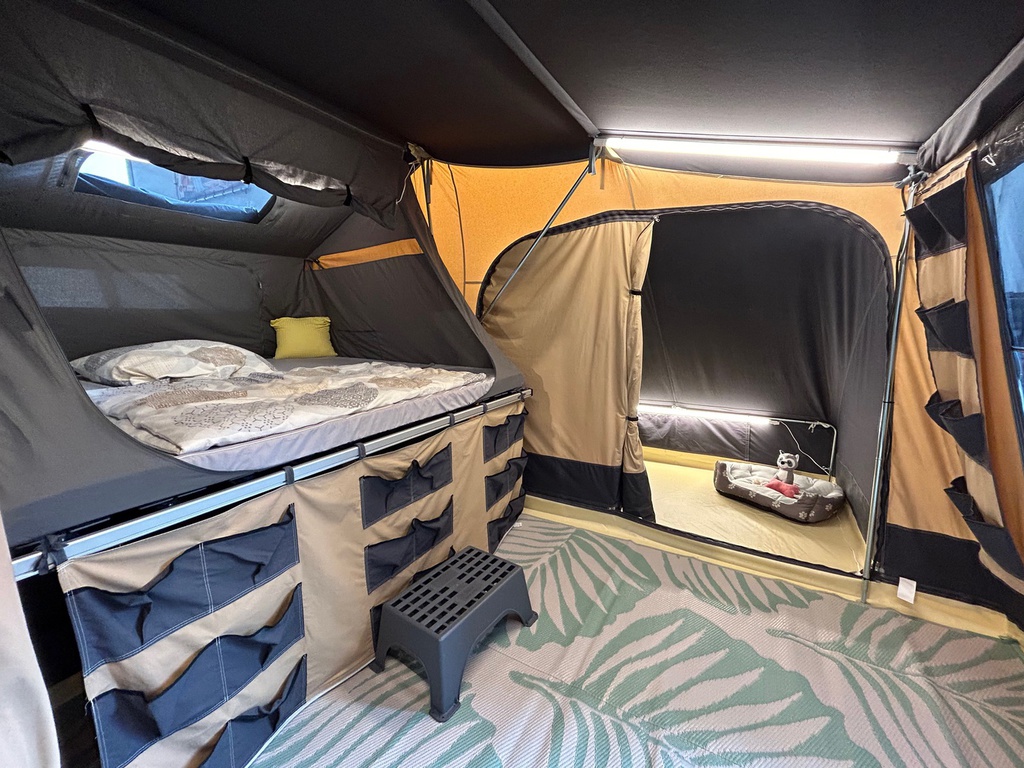 Die serienmäßige Bodenwanne lässt sich komfortabel mit Reißverschluss einsetzen. Die geräumige Schlafkabine im Hauptwagen hat