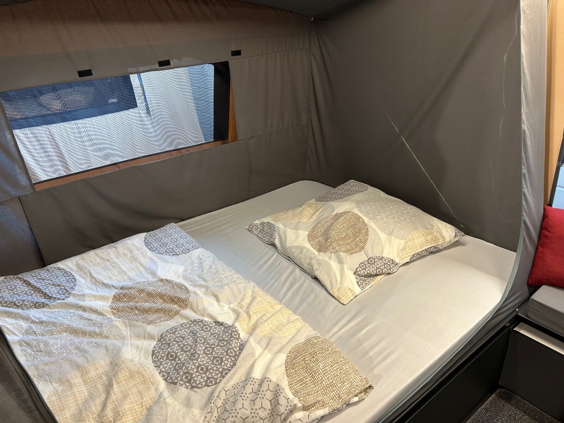 mit Reißverschluss einsetzen. Die beiden geräumigen Schlafkabinen im Hauptwagen haben Lattenrost und sind aus dunklem Stoff gefertigt, damit auch Langschläfer in Ruhe ausschlafen können.