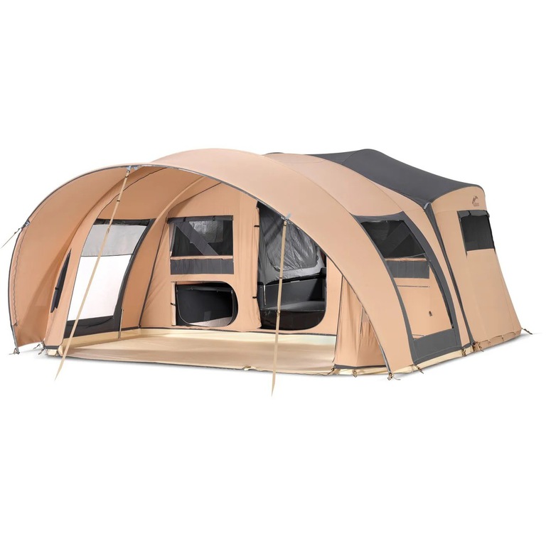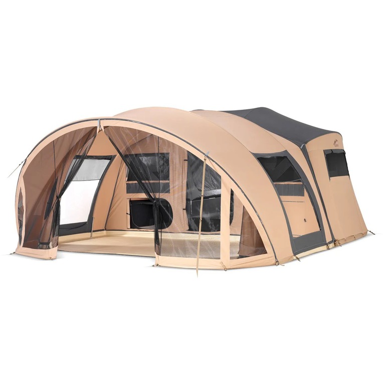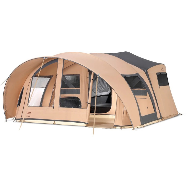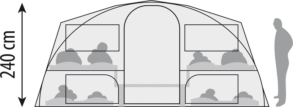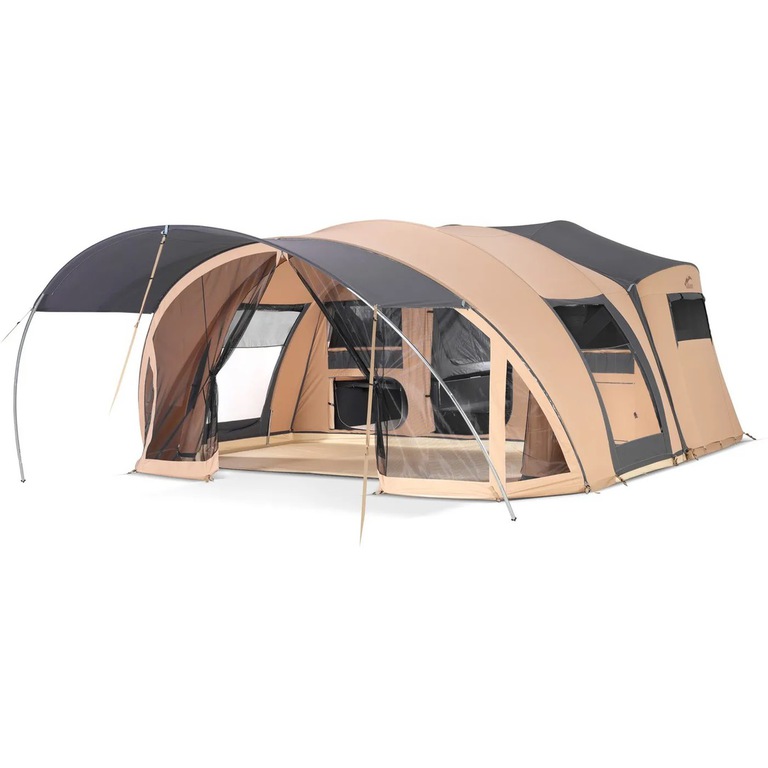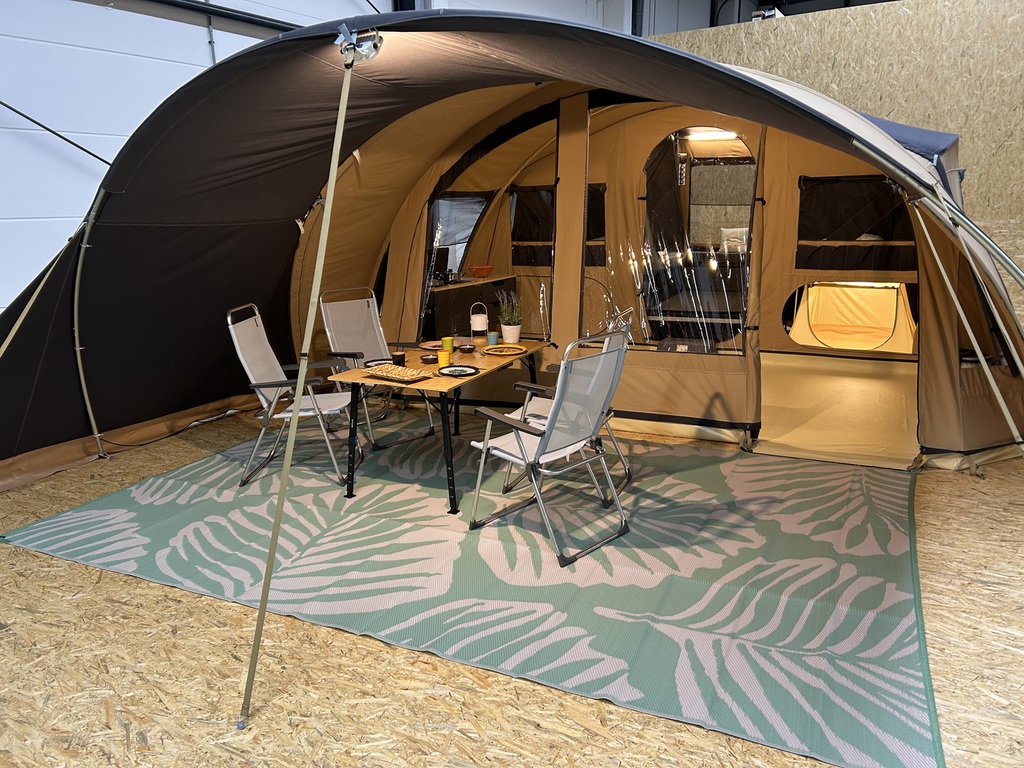5 m breite und 2,70 m tiefe Vorzelt bietet viel Platz und ein tolles Raumgefühl für die ganze Familie. Dank des Tunnelsystems, werden für den Aufbau des Vorzeltes nur 3 Stangenbögen benötigt und ist